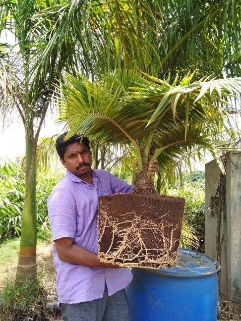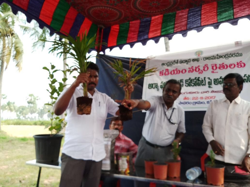 The Kadiyam Mandal of East Godavari District of Andhra Pradesh, spread over eleven villages occupying an area of 3500 acres is often touted as the nursery hub of India owing to the presence of a large number of ornamental and fruit nurseries. The nursery entrepreneurship provides employment to over 20,000 residents from nearby villages and other places. The planting material produced in this Mandal is known all over India for their quality and variety. From the year 2011, big nursery farmers from this region started exporting nursery plants to Middle East nations, thereby making a mark in the international arena. But commensurate to the expansion of the nursery entrepreneurship, the region has been facing the loss of precious top soil, which is a major input in the production of the nursery potting media. Alarmed by this situation the Department of Horticulture, Govt. of Andhra Pradesh requested ICAR-IIHR to train nursery men of the region on alternative substrates for nursery production. In this regard ICAR – IIHR organized a two day training programme during September 2016 on the production and utilization of Arka Fermented Cocopeat (AFC) for a batch of fifteen nurserymen, sponsored by the Department of Horticulture. Enthused by the training and the substrate performance, Mr. Namballa Durga Prasad, a young and progressive entrepreneur of the Savarappu Kadiyam village started to produce AFC and experiment with the production of various kinds of ornamental plants such as palms and flowering plants like petunias. He observed improved plant establishment as a result of better root development in AFC compared to the commercially available cocopeat and set up a polyhouse based nursery unit producing both vegetable and flower seedlings using AFC. In a meeting jointly organized by the Sir. Arthur Cotton Nursery Farmers Association of Kadiyam and Department of Horticulture on 22nd of November 2017 at Kadiyam ,he shared his experiences with the production of AFC and its performance in a variety of plants with fellow nursery men of the region who were highly impressed by the ease of preparation of the cocopeat, its cost effectiveness and superiority over commercially available cocopeat. According Mr. Durga Prasad, plants produced on AFC besides having superior establishment, weigh nearly two-third’s lower than plants raised on conventional potting media, thereby leading to savings on transport costs and handling expenditure. Dr.G.Selvakumar, Principal Scientist, addressed the gathering and asked them to take up AFC production for the production of better quality plants and to conserve precious top soil of the region. With the sustained effort by the Dept. of Horticulture, Govt. of A.P. and ICAR-IIHR it is expected that AFC wold continue to make an impact in the nursery hub of India.