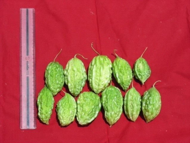 Fruits spindle shaped, glossy green skin colour without tubercles. Medium-sized fruits, Thick flesh, moderate bitterness, with less seeds. Yield 12 t/ha.
