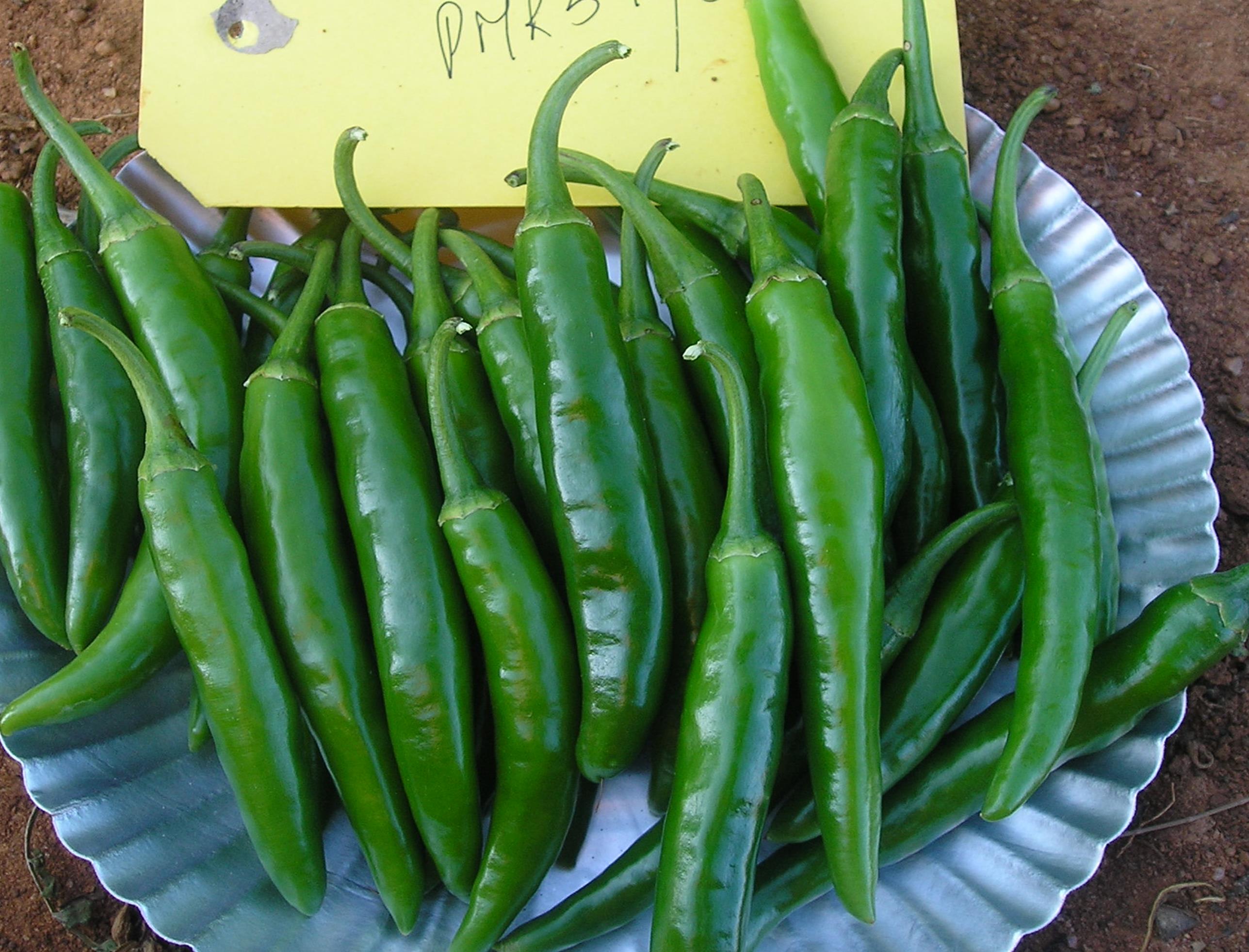 Plants medium tall & spreading, fruits green and turning red on maturity, smooth, medium long (6-7 x1cm), firm, pendent; pungent, tolerant to powdery mildew, yield potential yield potential 75-80q (green) or 12-15q (dry) per acre.