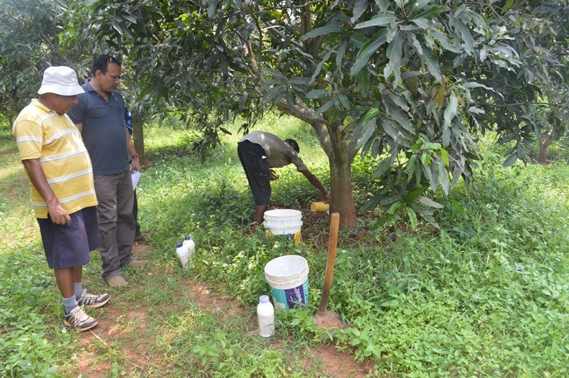 Sh. Deepak Panda and Sh. Ghanshyam Padhi of Denkanal, Odisha, progressive farmers, have been cultivating mango in more than 30 hectares of area. Most of their plantations are under high density (400 - 800 plants/ha). For last three years they were not getting desired yield in spite of proper orchard management. They told that they were growing different mango varieties like Amrapali, Langra, Alphonso, Dashehari, Banganapalli, Kesar, Himsagar, Mallika, etc., they could harvest 6-7 tonnes of mango per hectare and could earn about Rs. 80000-90000/ha in initial years, but the situation had changed from last three years as yield and profitability reduced by more than 50%. They realized that poor flowering, canopy overcrowding, high fruit drop and high incidence of pests and diseases were responsible for substantial yield reduction (3-4t/ha). During this period the CHES Bhubaneswar got approval from competent authority to conduct field experiment at farmers’ field. As such two progressive farmers namely Sh. Deepak Panda and Sh. Ghanshyam Padhi from Denkanal were selected and following interventions were taken up at their fields.
