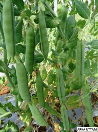 Tall, mid-season variety, tolerant to high temperature (up to 350 C). Pods are long and dark green coloured. Seeds are dark green, round in shape and sweet. Pod yield: 7.0 t/ha in 90 days