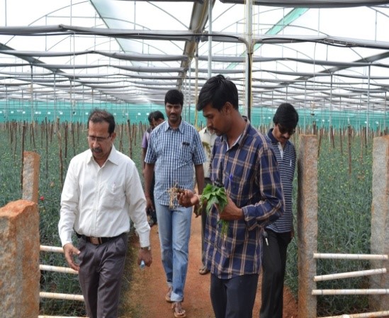 ICAR- IIHR conducted field days to disseminate the awareness on the use of biopesticides in crops grown under protected and open field conditions. Shri. Vishwanatha Reddy, progressive farmer from Agalagurki, Chikkaballapur, shared his experience with the farmers that the use of bio-agents reduced 30% of his chemical application and boosted the yield by 30% in capsicum grown under protected conditions. Shri. Hanumatharayappa and Shri. Rajanna, progressive farmers from Thammarasanahalli shared their experiences with the farmers that the use of bio-agents can boost crop yield of tomato and chilli (Anaheim type) by reducing the infestation of nematodes and associated diseases. For further information please contact the Director (director@iihr.ernet.in) with a copy to Dr. M. S. Rao, Principal Scientist, Division of Entomology and Nematology (msraobio45@gmail.com or msrao@iihr.ernet.in).